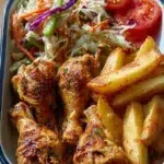 - Serve: Arrange baked chicken, wedges, coleslaw, and salad in a bowl or plate. Garnish with chopped parsley.