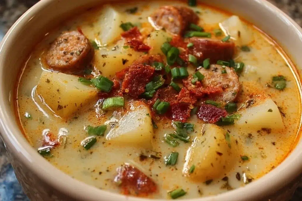 Start by browning the sausage, then cook the vegetables and spices, add potatoes and broth, and simmer until the potatoes are soft. Finish with cream and cheese for a rich texture. If you want a meaty twist, look at this creamy Italian sausage potato soup for a similar idea.