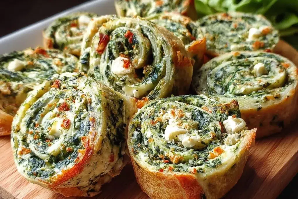 This recipe makes a creamy spinach spread rolled in spinach tortillas and cut into small rounds. You make the filling, spread it on the tortilla, roll, chill, and slice. You get bite-size pinwheels that hold well and taste great. If you like a different cheese twist, try a similar idea with the spinach and feta pinwheels recipe for another flavor.