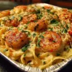 A warm, cheesy meal featuring juicy shrimp baked on saucy pasta, perfect for weeknights or entertaining.