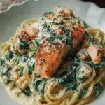 This pasta balances indulgence and simplicity. Heavy cream gives the sauce a luxuriously smooth mouthfeel while fresh spinach adds color and a mild vegetal lift. Salmon cooks quickly and brings protein plus healthy omega-3s, making this a satisfying one-skillet meal that’s excellent for busy nights, date-night at home, or an impressive family dinner.