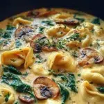 A cozy one-pot soup featuring tender cheese tortellini in a creamy broth with mushrooms and fresh spinach, perfect for weeknights or dinner parties.