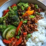 This bowl is quick, tasty, and fills you up. It mixes savory ground meat, colorful veggies, and hot rice in one bowl. You get protein, veggies, and comfort in a simple meal. If you like fast dinners, also see this easy dessert to finish the meal: baked apples with feta, honey and cranberries.