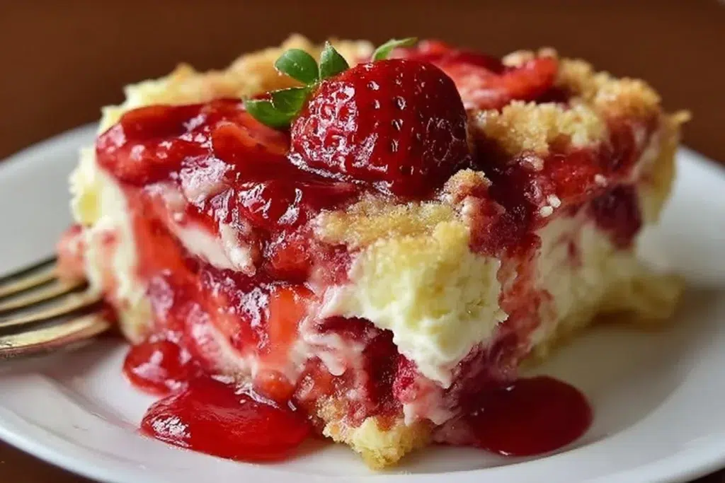 This section walks you through the process in plain words without repeating the full directions. First, preheat your oven and grease a 9×13 pan so the cake won’t stick. Mix softened cream cheese with sugar and vanilla until smooth; that becomes the cheesecake layer. Spoon the strawberry pie filling across the pan, then spread the cream cheese mix gently on top so the layers stay distinct. Sprinkle the dry yellow cake mix evenly over the cream cheese—don’t mix it in. Drizzle melted butter across the dry mix so it bakes into a golden top. Bake until the edges bubble and the top turns golden brown. Let it cool so layers set, then spread thawed whipped topping and add fresh strawberries or a dusting of powdered sugar. Chill briefly if you want neat slices. Small steps, big payoff.
