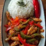 A quick and flavorful dish that combines tender chicken, crunchy peppers, and warm steamed rice in a glossy sauce.